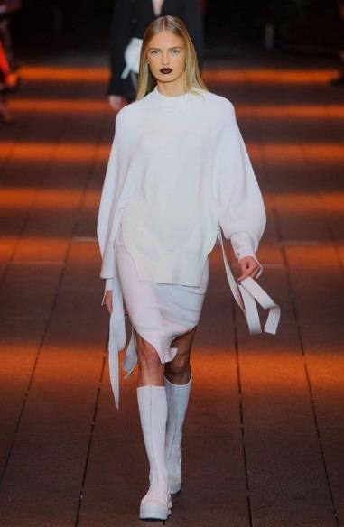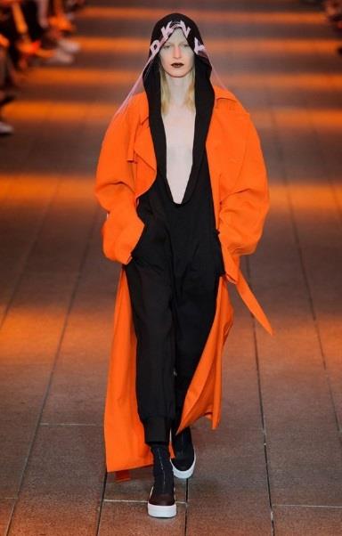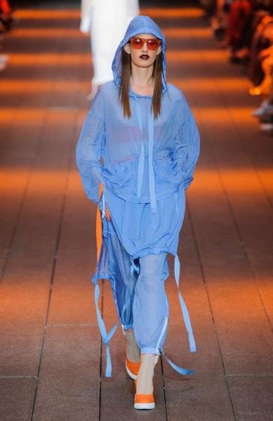Η Bella Hadid άνοιξε το show φορώντας ένα κοστούμι-φόρεμα με κουκούλα που αποτελεί το τέλειο look για μία red carpet εμφάνιση. Crop tops, παντελόνια, φόρμες και φούτερ ήταν τα κομμάτια που ακολούθησαν σε αποχρώσεις του μπλε, κρεμ και στο χρώμα της ελιάς, ενώ πολλά απ' τα κομμάτια είχαν ασύμμετρα κοψίματα στο στρίφωμα.
