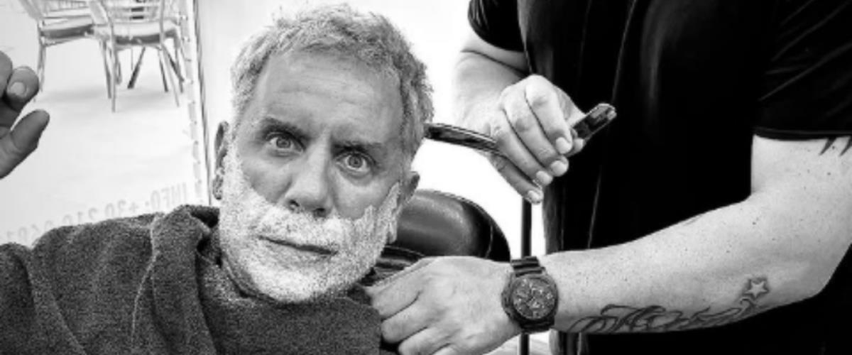 Στη φωτογραφία, ο Γιώργος Μαζωνάκης φαίνεται καθισμένος στην καρέκλα του κουρείου, με αφρό ξυρίσματος στο πρόσωπο, αποτυπώνοντας τη στιγμή της φροντίδας της εμφάνισής του.