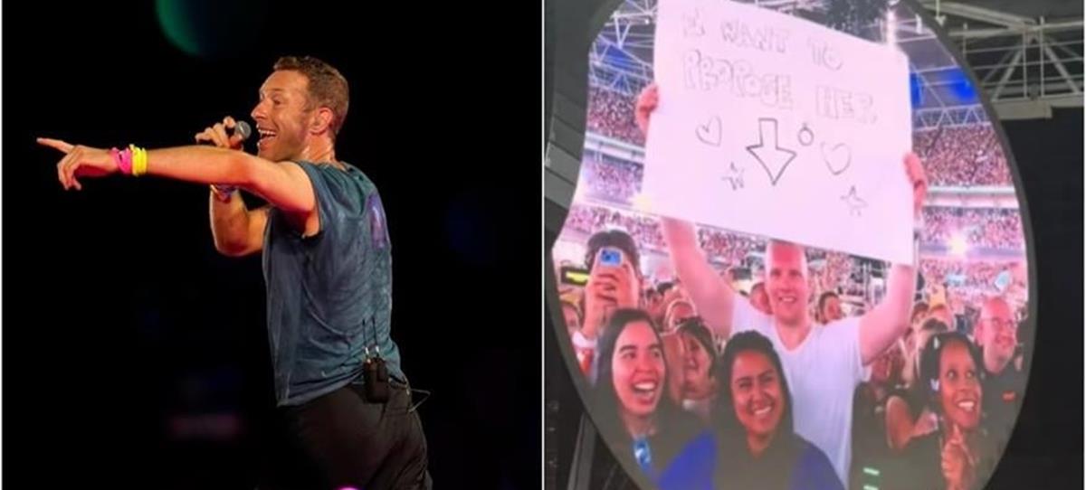 Καθώς η κάμερα του σταδίου εστίασε σε έναν άνδρα που κρατούσε ένα πλακάτ ζητώντας να του δοθεί η ευκαιρία να κάνει πρόταση γάμου στη σύντροφό του, ο τραγουδιστής των Coldplay διέκοψε για λίγο το πρόγραμμα και πήρε τον λόγο.