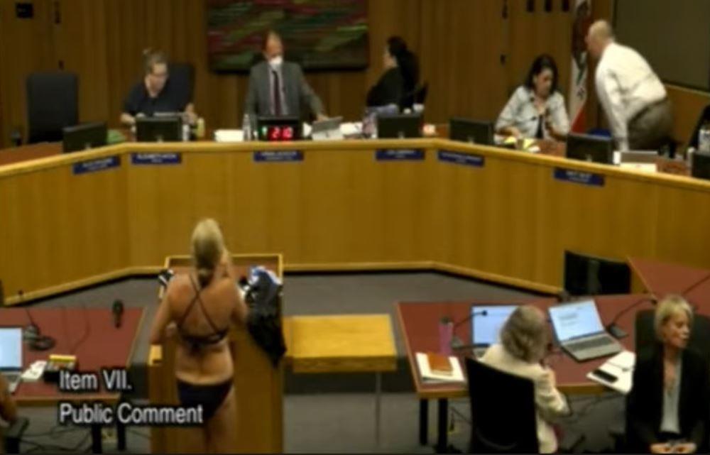 Κατά τη διάρκεια ομιλίας της σε συνεδρίαση του σχολικού συμβουλίου στην Καλιφόρνια, μια «ακτιβίστρια για τα δικαιώματα των γονέων» γδύθηκε μένοντας το μαγιό της κατά τη διάρκεια των δημόσιων σχολίων για να διαμαρτυρηθεί.