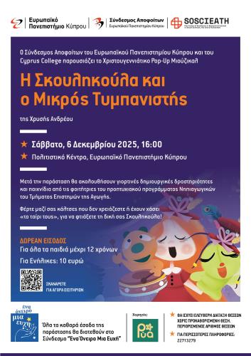 Ο Σύνδεσμος Αποφοίτων του Ευρωπαϊκού Πανεπιστημίου Κύπρου και του Cyprus College παρουσιάζει το παιδικό χριστουγεννιάτικο μιούζικαλ «Η Σκουληκούλα και ο Μικρός Τυμπανιστής» της Χρυσής Ανδρέου.
