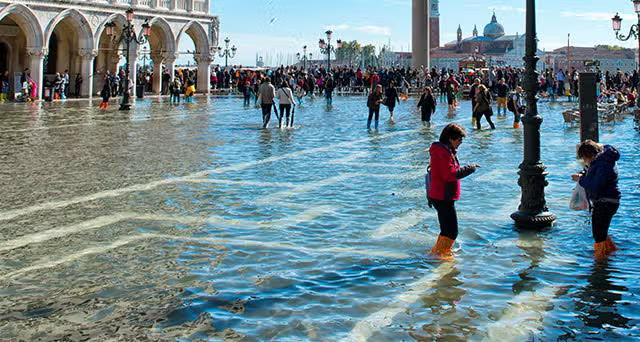 Όταν η στάθμη των νερών ξεπερνά το ένα μέτρο, η πλατεία του Αγίου Μάρκου να πλημμυρίζει συχνά, όπως έγινε και πριν λίγες ημέρες, κατά την διάρκεια του Καρναβαλιού της Βενετίας.