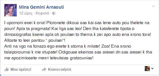 «Ένα χρόνο ταλαιπωρούμαι και με χτυπάτε. Οδηγούσε εκείνος σας αρέσει δεν σας αρέσει και θα με αποζημιώσετε μέχρι τελευταίας γρατζουνιάς» γράφει μεταξύ άλλων η Μίνα Αρναούτη.