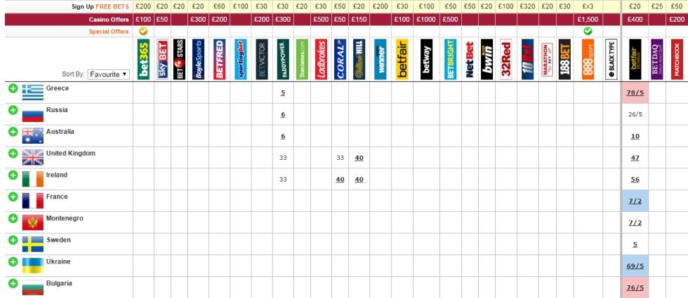 Τα γραφεία στοιχημάτων τοποθετούν την Ελλάδα στην πρώτη θέση, ενώ δεν έχει γίνει γνωστό ακόμα το τραγούδι! Πρόκειται για ένα αξιοσημείωτο γεγονός που δείχνει την υποδοχή που επιφυλάσσει η Ευρώπη στην ελληνική συμμετοχή.