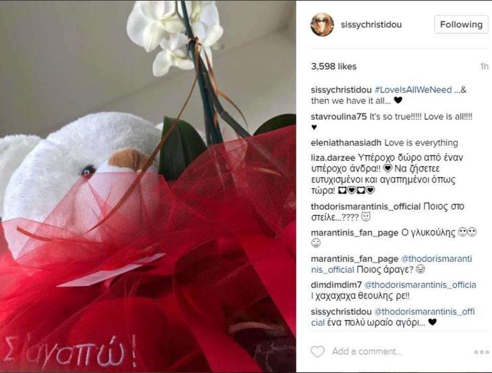 Η Σίσσυ Χρηστίδου και ο Θοδωρής Μαραντίνης είναι από τα πιο αγαπημένα ζευγάρια της showbiz. Το ζευγάρι πάντα μας εκπλήσσει με τις όμορφες δηλώσεις του και σήμερα η Σίσσυ μας έδειξε τι δώρο της έκανε ο αγαπημένος της! Ένα αρκουδάκι, μια κόκκινη καρδιά που λέει σ' αγαπώ κι ένα λουλούδι ήταν αρκετά για να εκφράσει την αγάπη του στη γυναίκα του και η Σίσσυ δημοσίευσε φωτογραφία στο instagram με το δώρο της γράφοντας: «#LoveIsAllWeNeed ...& then we have it all...»