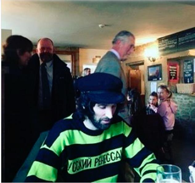 Συγκεκριμένα ο κιθαρίστας του γκρουπ από το Λέστερ απολάμβανε το γεύμα του στην παμπ, όταν ο βασιλικός επισκέπτης μπήκε μέσα. Η φωτογραφία δείχνει τον κιθαρίστα των Kasabian πρώτο πλάνο και στο βάθος τον πρίγκιπα Κάρολο με κοστούμι και μπότες να μιλάει σε κάποια παιδιά.