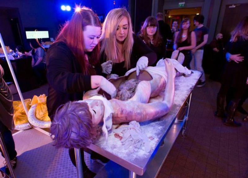 Στη συνέχεια αφού έχουν μαζευτεί όλα τα πιάτα, φορούν προστατευτικά γάντια και… ξεκινούν τα μαθήματα ανατομίας, όπου πέρα από τον δάσκαλο βοηθούν και παθολόγοι από το νοσοκομείο του Σέφιλντ, το οποίο παρέχει τον ιατρικό εξοπλισμό.