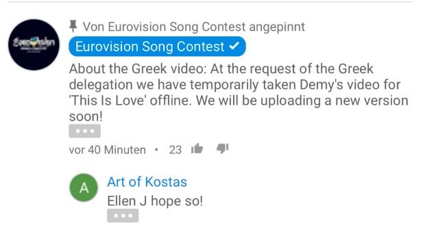 «About the Greek video: At the request of the Greek delegation we have temporarily taken Demy’s video for ‘This Is Love’ offline. We will be uploading a new version soon!»