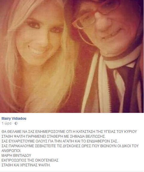 Σύμφωνα με μήνυμα της εκπροσώπου της οικογένειας, Μαίρη Βιντιάδου, στο facebook, σημάδια βελτίωσης παρουσιάζει η κατάσταση της υγείας του δημοφιλή ηθοποιού Στάθη Ψάλτη,.