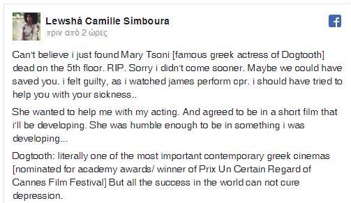 «Δεν το πιστεύω ότι μόλις βρήκα νεκρή την Μαίρη Τσώνη (διάσημη Ελληνίδα ηθοποιό του Κυνόδοντα) στον 5ο όροφο. RIP. Συγγνώμη που δεν ήρθα νωρίτερα. Ίσως θα μπορούσαμε να σε σώσουμε. Αισθάνθηκα ένοχη, ενώ έβλεπα τον Τζέιμς να σου παρέχει τις πρώτες βοήθειες (καρδιοαναπνευστική ανάνηψη). Έπρεπε να προσπαθήσω να σε βοηθήσω με την αρρώστια σου.