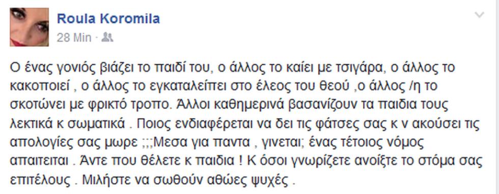 Η παρουσιάστρια ενημερώθηκε για το βρέφος στην Πάτρα που κακοποιήθηκε από τους γονείς του και ξέσπασε στο Facebook: «Ο ένας γονιός βιάζει το παιδί του, ο άλλος το καίει με τσιγάρα, ο άλλος το κακοποιεί, ο άλλος το εγκαταλείπει στο έλεος του Θεού, ο άλλος /η το σκοτώνει με φρικτό τρόπο. Άλλοι καθημερινά βασανίζουν τα παιδιά τους λεκτικά και σωματικά. Ποιος ενδιαφέρεται να δει τις φάτσες σας και να ακούσει τις απολογίες σας μωρέ;; Μέσα για πάντα, γίνεται; Ένας τέτοιος νόμος απαιτείται. Άντε που θέλετε και παιδιά! Και όσοι γνωρίζετε ανοίξτε το στόμα σας επιτέλους. Μιλήστε να σωθούν αθώες ψυχές».