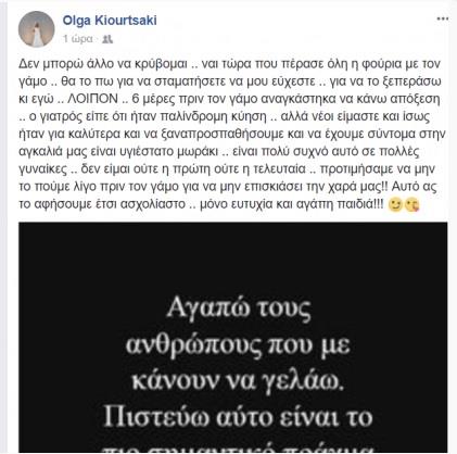 «Δεν μπορώ άλλο να κρύβομαι .. ναι τώρα που πέρασε όλη η φούρια με τον γάμο .. θα το πω για να σταματήσετε να μου εύχεστε .. για να το ξεπεράσω κι εγώ .. ΛΟΙΠΟΝ .. 6 μέρες πριν τον γάμο αναγκάστηκα να κάνω απόξεση .. ο γιατρός είπε ότι ήταν παλίνδρομη κύηση .. αλλά νέοι είμαστε και ίσως ήταν για καλύτερα και να ξαναπροσπαθήσουμε και να έχουμε σύντομα στην αγκαλιά μας είναι υγιέστατο μωράκι .. είναι πολύ συχνό αυτό σε πολλές γυναίκες .. δεν είμαι ούτε η πρώτη ούτε η τελευταία .. προτιμήσαμε να μην το πούμε λίγο πριν τον γάμο για να μην επισκιάσει την χαρά μας!! Αυτό ας το αφήσουμε έτσι ασχολίαστο .. μόνο ευτυχία και αγάπη παιδιά!!!» έγραψε στο facebook η Όλγα Κιουρτσάκη.