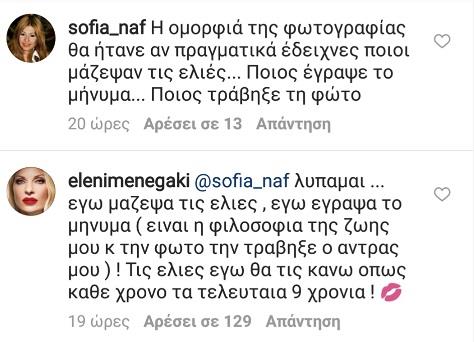 «Λυπάμαι… Εγώ μάζεψα τις ελιές, εγώ έγραψα το μήνυμα (είναι η φιλοσοφία της ζωής μου) και την φώτο την τράβηξε ο άντρας μου! Τις ελιές θα τις κάνω όπως κάθε χρόνο, εδώ και 9 χρόνια!», απάντησε η Ελένη Μενεγάκη.