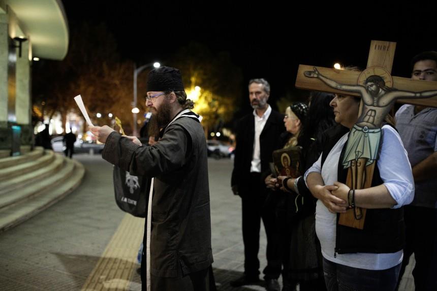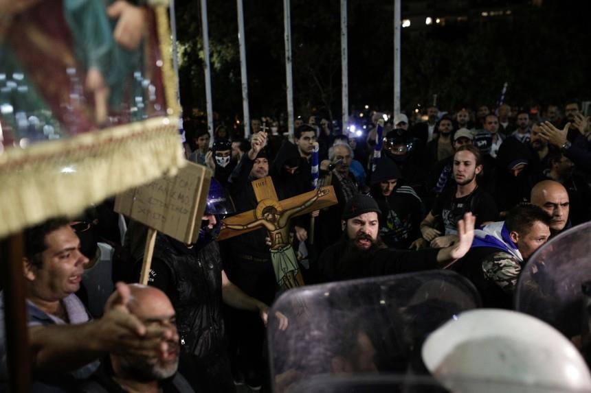 Σύμφωνα με το voria.gr, οι συγκεντρωμένοι φώναξαν συνθήματα, όπως το «Κάτω τα χέρια από την Παναγία», και έψαλλαν τον Ακάθιστο Ύμνο ενώ, σε κάποια στιγμή, στην προσπάθειά τους να σπάσουν το αστυνομικό μπλόκο, έστρεψαν τα κοντάρια των σημαιών που κρατούσαν κατά των αστυνομικών.