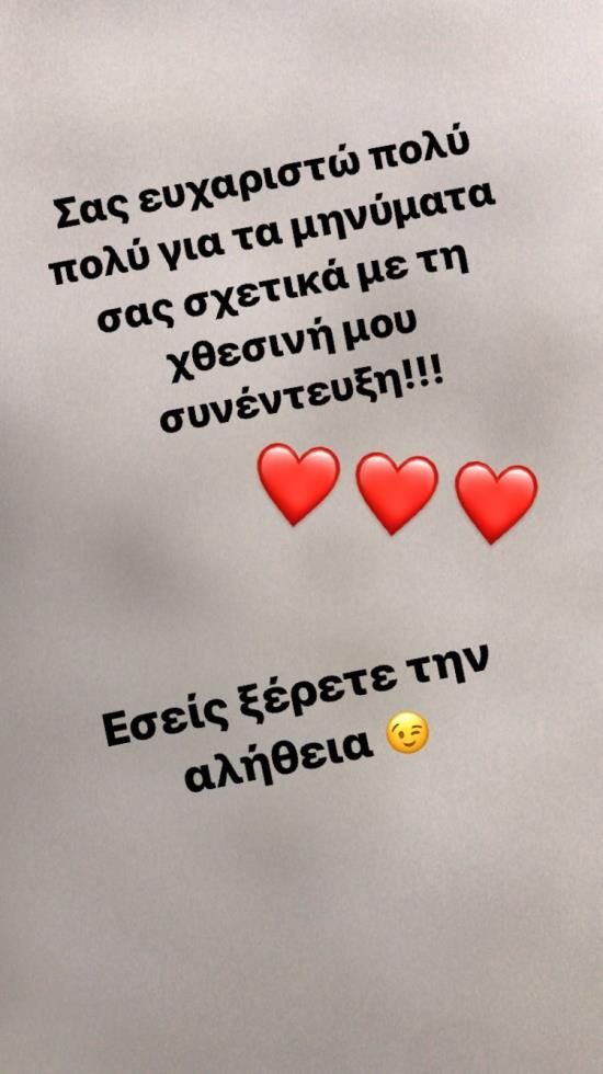 Συγκεκριμένα η Κωνσταντίνα Σπυροπούλου ανέβασε στα instastories μια εικόνα, στην οποία ευχαριστεί, μεταξύ άλλων, τους διαδικτυακούς της φίλους για τα μηνύματα που της έστειλαν, ενώ γράφει με νόημα: «Εσείς ξέρετε την αλήθεια».