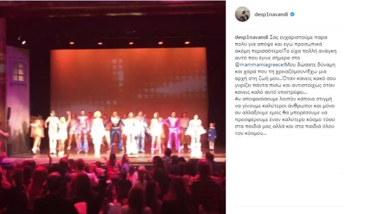 "Σας ευχαριστούμε παρα πολύ για απόψε και εγώ προσωπικά ακόμη περισσότερο!Το είχα πολλή ανάγκη αυτό που έγινε σήμερα στο @mammamiagreece!Μου δώσατε δύναμη και χαρά που τη χρειαζόμουν!Εχω μια αρχή στη ζωή μου…Όταν κανεις κακό σου γυρίζει πάντα πίσω και αντιστοίχως όταν κανεις καλό αυτό επιστρέφει… Αν αποφασίσουμε λοιπόν κάποια στιγμή να γίνουμε καλύτεροι άνθρωποι και μόνο αν αλλάξουμε εμείς θα μπορέσουμε να προσφέρουμε έναν καλύτερο κόσμο τόσο στα παιδιά μας αλλά και στα παιδιά όλου του κόσμου…" έγραψε.