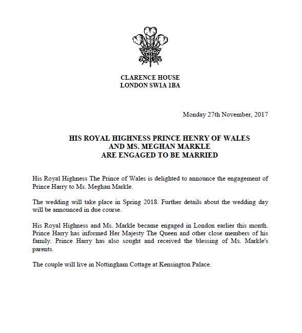 "Η αυτού μεγαλειότης, ο πρίγκιπας της Ουαλίας, είναι στην ευχάριστη θέση να ανακοινώσει τους αρραβώνες του πρίγκηπα Harry και της Meghan Markle" με αυτή τη φράση ξεκινούσε η ανακοίνωση του Οίκου Clarence, της βασιλικής δηλαδή οικογένειας στο Ηνωμένο Βασίλειο.