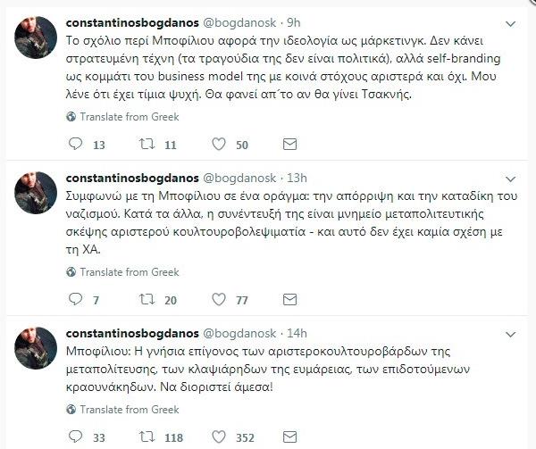 Το σχόλιο περί Μποφίλιου αφορά την ιδεολογία ως μάρκετινγκ. Δεν κάνει στρατευμένη τέχνη (τα τραγούδια της δεν είναι πολιτικά), αλλά self-branding ως κομμάτι του business model της με κοινά στόχους αριστερά και όχι. Μου λένε ότι έχει τίμια ψυχή. Θα φανεί απ’ το αν θα γίνει Τσακνής».