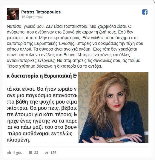 Ο Πέτρος Τατσόπουλος με ανάρτησή του στο facebook  σχολίασε με σκληρό τρόπο τα όσα είπε η Νατάσσα Μποφίλιου.