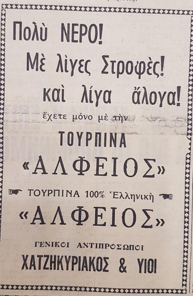 Εντύπωση προκαλούν τα μότο που χρησιμοποιούσαν τότε, όπως για παράδειγμα «Πολύ νερό με λίγες στροφές και λίγα άλογα», όπου διαφημιζόταν μια τουρμπίνα.