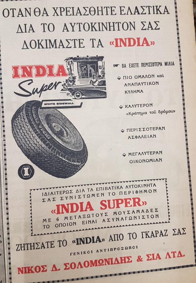Σε διαφήμιση για ελαστικά αναγραφόταν ότι «όταν θα χρειασθήτε ελαστικά δια το αυτοκίνητο σας δοκιμάστε τα «INDIA».
