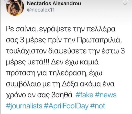 Ο ίδιος εξέφρασε την ενόχληση του με ανάρτηση που έκανε στο προσωπικό του λογαριασμό στο twitter όπου και ζήτησε να αποκατασταθεί η αλήθεια.