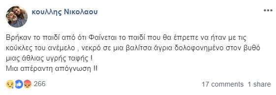 "Βρήκαν το παιδί που θα έπρεπε να ήταν με τις κούκλες του ανέμελο, νεκρό σε μια βαλίτσα άγρια δολοφονημένο στον βυθό μιας άθλιας υγρής ταφής! Μια απέραντη απόγνωση!!" έγραψε στον προσωπικό του λογαριασμο του στα social media και τα λόγια είναι φτωχά...