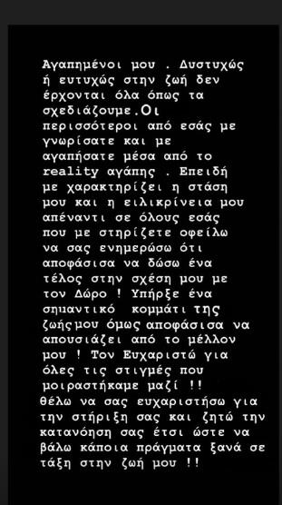 «Αγαπημένοι μου, δυστυχώς ή ευτυχώς στη ζωή δεν έρχονται όλα όπως τα σχεδιάζουμε. Οι περισσότεροι από εσάς με γνωρίσατε και με αγαπήσατε μέσα από το ριάλιτι αγάπης. Επειδή με χαρακτηρίζει η στάση μου και η ειλικρίνειά μου απέναντι σε όλους εσάς που με στηρίζετε, οφείλω να σας ενημερώσω ότι αποφάσισα να δώσω ένα τέλος στη σχέση μου με τον Δώρο. Υπήρξε ένα σημαντικό κομμάτι της ζωής μου, όμως αποφάσισα να απουσιάζει από το μέλλον μου. Τον ευχαριστώ για όλες τις στιγμές που μοιραστήκαμε μαζί. Θέλω να σας ευχαριστήσω για τη στήριξή σας και την κατανόηση σας έτσι ώστε να βάλω κάποια πράγματα ξανά σε τάξη στη ζωή σου» ήταν το μήνυμα με το οποίο ανακοίνωσε τον χωρισμό της από τον Δώρο η Αθηνά.
