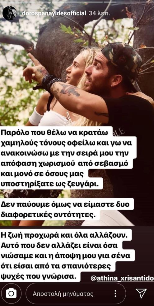 Λίγη ώρα μετά την ανάρτηση της Αθηνάς Χρυσαντίδου, ο Δώρος Παναγίδης σε δική του ανάρτηση στα instastories έγραψε: «Παρόλο που θέλω να κρατάω χαμηλούς τόνους, οφείλω και εγώ να ανακοινώσω με τη σειρά μου την απόφαση του χωρισμού, από σεβασμό και μόνο σε όσους μας υποστηρίξατε ως ζευγάρι.