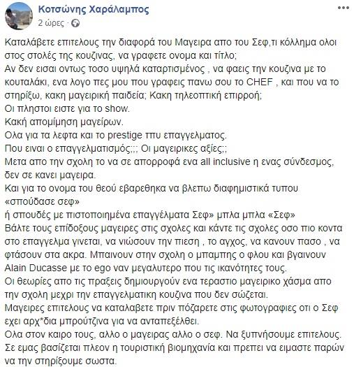 Ένα απίστευτο ξέσπασμα στο Facebook από τον Χαράλαμπο Κοτσώνη, ο οποίος έγινε γνωστός μέσα από τη συμμετοχή του στο φετινό MasterChef και την πολυσυζητημένη ατάκα του, «Έν Κουλί».