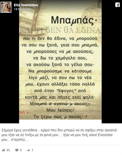 «Σήμερα έχεις γενέθλια… κρίμα που δεν μπορώ να σε σφίξω στην αγκαλιά μου τζιαι να σε πνίξω με τα φιλιά μου … τζιαι να μου πείς κανεί Ελιούσκα μου… σ’αγαπώ….» , έγραψε χαρακτηριστικά η Έλια Ιωαννίδου και δεν άφησε κανένα ασυγκίνητο.