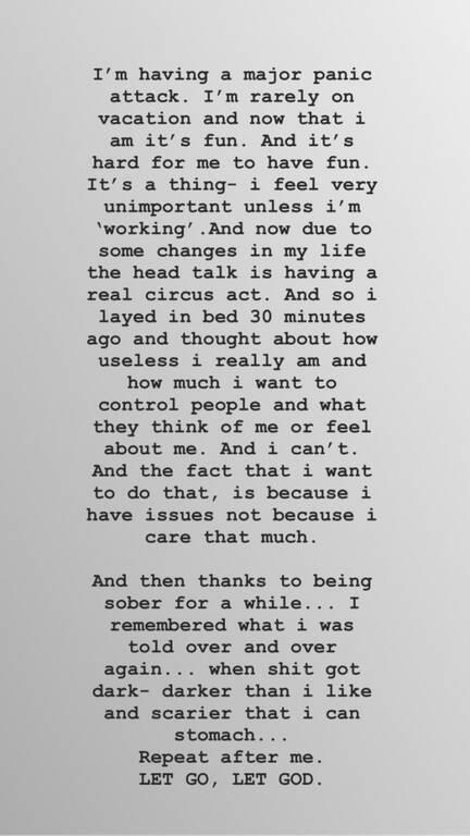 Συγκεκριμένα έγραψε: «Αυτή τη στιγμή έχω πάθει κρίση πανικού. Σπανίως βρίσκομαι σε διακοπές και θα έπρεπε να διασκεδάζω. Αλλά είναι δύσκολο για μένα να διασκεδάσω. Το θέμα είναι πως νιώθω τελείως ασήμαντη όσο δεν δουλεύω. Ξάπλωσα στο κρεβάτι πριν μισή ώρα και σκέφτηκα πόσο άχρηστη πράγματι είμαι και πόσο θέλω να χειρίζομαι τους ανθρώπους και οτιδήποτε σκέφτονται ή νιώθουν για εμένα. Και δε μπορώ. Και η αλήθεια είναι πως θέλω να το κάνω αυτό επειδή έχω προβλήματα και όχι επειδή με ενδιαφέρει τόσο πολύ. Και μετά, χάρη στου ότι είμαι νηφάλια για λίγο, θυμήθηκα τι μου λένε και μου ξαναλένε να κάνω όταν τα πράγματα ‘’παίρνουν την κάτω βόλτα’’. Επαναλάβετε μετά από μένα: ‘’Άστο να περάσει, άστο να περάσει’’»!