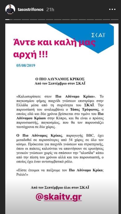 "Ο πιο αδύναμος κρίκος έρχεται και στην Ελλάδα! Από τον Σεπτέμβριο στο ΣΚΑΙ!!! Δηλώστε συμμετοχή και κερδίστε μέχρι και 10,000 ευρώ το επεισόδιο . Τηλ. 211-1885595 ή στο adinamoskrikos.skaitv.gr . Είστε έτοιμοι να παίξουμε τον ΠΙΟ ΑΔΥΝΑΜΟ ΚΡΙΚΟ ; Ρολοοόιιι !!!" έγραψε ενώ σε άλλη ανάρτηση ευχήθηκε καλή επιτυχία σε αυτό το νέο ξεκίνημα.