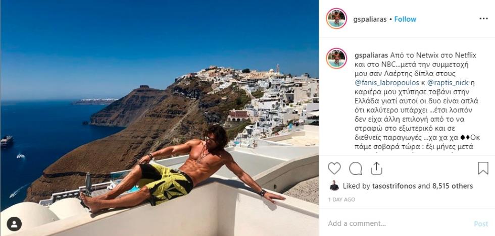 Συγκεκριμένα, έγραψε: «Από το Netwix στο Netflix και στο NBC…μετά την συμμετοχή μου σαν Λαέρτης δίπλα στους @fanis_labropoulos κ @raptis_nick η καριέρα μου χτύπησε ταβάνι στην Ελλάδα γιατί αυτοί οι δυο είναι απλά ότι καλύτερο υπάρχει …έτσι λοιπόν δεν είχα άλλη επιλογή από το να στραφώ στο εξωτερικό και σε διεθνείς παραγωγές …χα χα χα ♠️♦️ Οκ πάμε σοβαρά τώρα: έξι μήνες μετά το πρώτο τηλεφώνημα και λίγες μέρες μετά την τελική συμφωνία και ακόμα δεν μπορώ να το συνειδητοποιήσω καλά καλά …παρόλα αυτά οφείλω να ευχαριστήσω την Ελληνίδα διευθύντρια παραγωγής Ηλεκτρα Αποστολακη που πίστεψε σε εμένα και με πρότεινε για τον ρόλο , χωρις εσένα δεν θα είχε γίνει τιποτα, την Ελένη Μαγκονακη που συγκέντρωσε και μετέφρασε το υλικό μου από σειρές….ευχαριστώ τον πρώτο μου σκηνοθέτη Κώστα Κωστόπουλο και την πρώτη μου σεναριογράφο την Βανα Δημήτριου που με έμαθαν να πετάω κ να ταξιδεύω στον χώρο κ στον χρόνο…δυο μέρες πριν την αναχώρηση για το Μεξικό σας αφήνω με αυτή την Φωτο από την πανέμορφη Σαντορίνη που είναι και οι τελευταίες μου διακοπές για φέτος …αυτή η νίκη είναι αφιερωμένη στον πατέρα μου και σε όσους με αγαπούν και πιστεύουν σε εμένα El sēnor de los Cielos Lord of the skies».