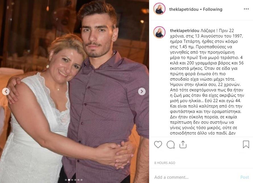 Ο γιος της Λάζαρος έκλεισε τα 22 του χρόνια και η Θέκλα Πετρίδου συγκινημένη και ευτυχισμένη έγραψε στον προσωπικό της λογαριασμό στο instagram: