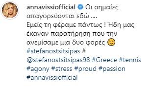 Όσα έγιναν ακριβώς περιέγραψε η ίδια η Άννα Βίσση στην ανάρτηση που έκανε στο Instagram. «Οι σημαίες απαγορεύονται εδώ. Εμείς τη φέραμε πάντως! Ήδη μας έκαναν παρατήρηση που την ανεμίσαμε μια δυο φορές», έγραψε χαρακτηριστικά η τραγουδίστρια.