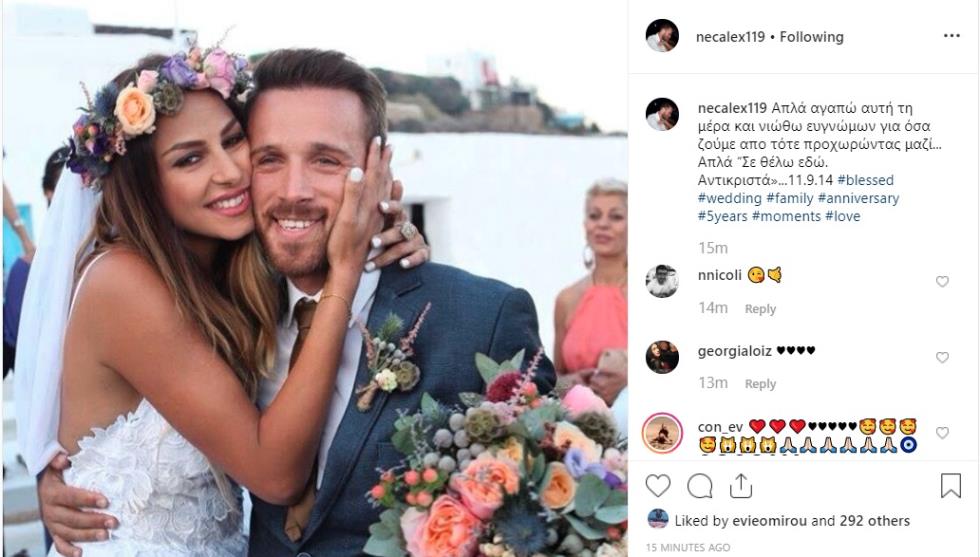 «Απλά αγαπώ αυτή τη μέρα και νιώθω ευγνώμων για όσα ζούμε από τότε προχωρώντας μαζί... Απλά “Σε θέλω εδώ. Αντικριστά...11.9.14 #blessed #wedding #family #anniversary #5years #moments #love» έγραψε στο μήνυμα του για την επέτειο του γάμου τους, αποδεικνύοντας ότι παραμένει ακόμη τρελά ερωτευμένος με την Κωνσταντίνα του.