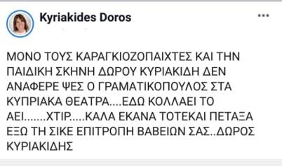 Με μια ανάρτηση του αναφέρει: Μονο τους καραγκιοζοπαίχτες και την παιδική σκηνή Δώρου Κυριακίδη δεν ανέφερε ψες ο Γραμματικόπουλος στα κυπριακά θέατρα. Εδώ κολλάει το άι σιχτίρ καλά έκανα τότε και πέταξα έξω τη σικέ επιτροπή βραβείων σας