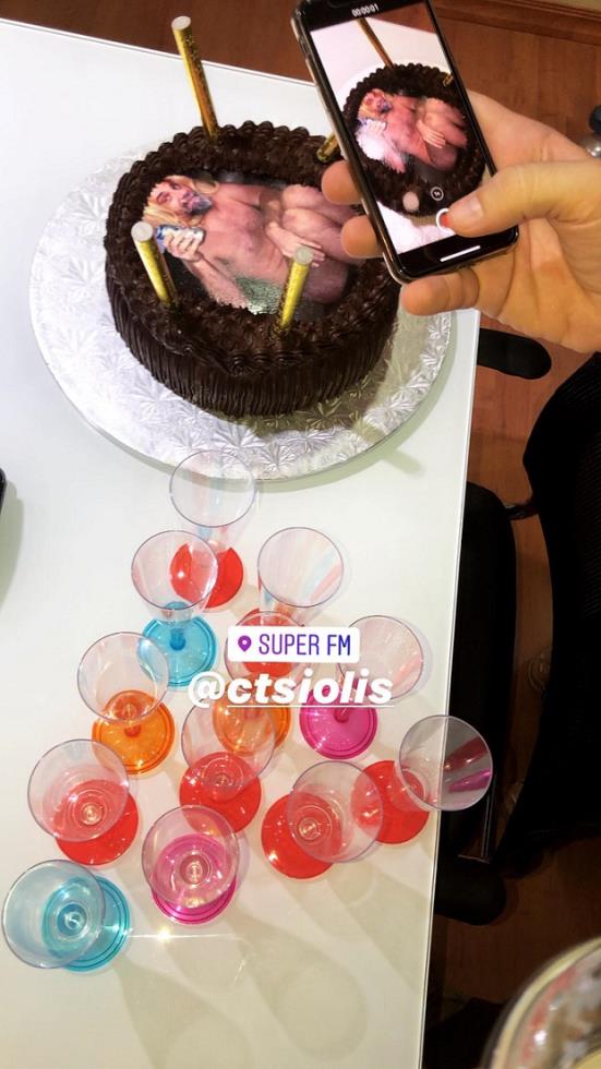Ανάμεσα στις εκπλήξεις που του ετοίμασαν, μια χορεύτρια bellydance και μια τούρτα που έφερε πάνω μια φωτογραφία του ίδιου σε μια... γυμνή στιγμή του.