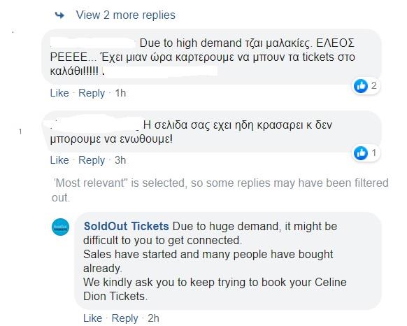 Αρκετοί τυχεροί φαν έχουν ήδη καταφέρει να πάρουν τα εισιτήρια τους ενώ οι θαυμαστές της Celine Dion που δεν μπόρεσαν ακόμη να εξυπηρετηθούν από το σύστημα, δεν σταματούν να αφήνουν τα μηνύματα απογοήτευσης τους στις σελίδες της εταιρείας που ανέλαβε την προπώληση των εισιτηρίων.