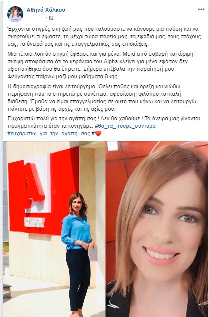 Την απρόσμενη αποχώρηση της, γνωστοποίησε η ίδια μέσα από ένα μακροσκελές μήνυμα στο προσωπικό της λογαριασμό στο Facebook. Η δημοσιογράφος Αθηνά Χάλκου δε ανήκει πια στον Alpha και φεύγοντας έκανε και τα παράπονα της....