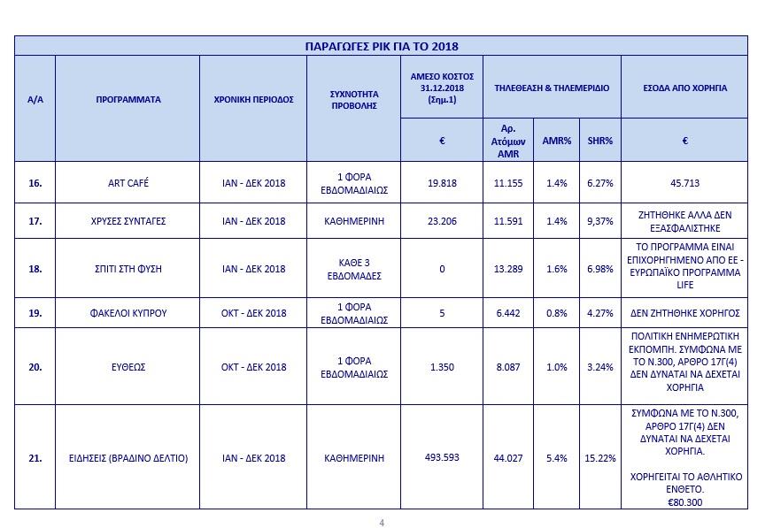 To συνολικό κόστος των εσωτερικών παραγωγών του ΡΙΚ ανήλθε σύμφωνα με την έκθεση στο €1.686.332 και των συμπαραγωγών ανήλθε στο €1.251.950.