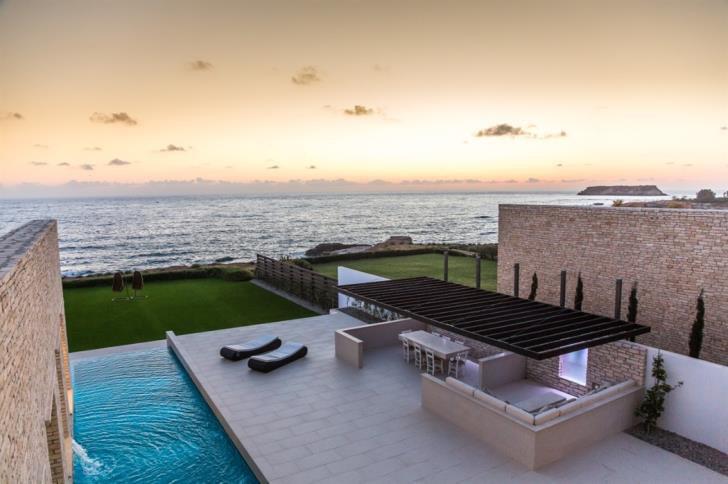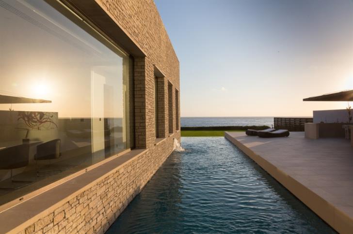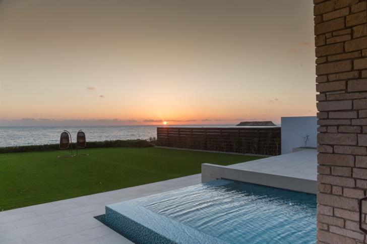 Η έπαυλη έχει θέα το απέραντο γαλάζιο της Μεσογείου και τα ηλιοβασιλέματα είναι μοναδικά και μαγευτικά με φόντο την Γερόνησο.