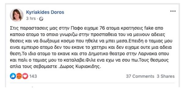 «Στις παραστάσεις μας στην Πάφο είχαμε 76 άτομα κρατήσεις fake από κάποιο άτομο το οποίο γνωρίζω στην προσπάθεια του να μείνουν άδειες θέσεις και να διώξουμε κόσμο που ήθελε να μπει μέσα.