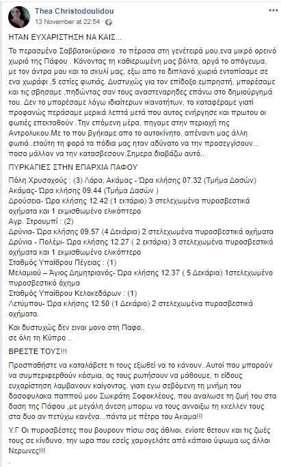 Προσπαθήστε να καταλάβετε τι τους εξωθεί να το κάνουν..Αυτοί που μπορούν να συμπεριφερθούν κόσμια, ας τους ρωτήσουν να μάθουμε, τι είδους ευχαρίστηση λαμβάνουν καίγοντας, γιατί εγ'ω σεβόμενη τη μνήμη του δασοφύλακα παππού μου Σωκράτη Σοφοκλέους, που ανάλωσε τη ζωή του στα δαση της Πάφου ,με μεγάλη άνεση μπορώ να τους ανοίξω τη κκελλέν τους στα δυο αν πετύχω κανένα...πάντα με πέτρα του Ακάμα!!!