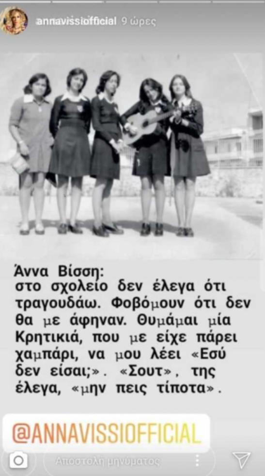 "Στο σχολείο δεν έλεγα ότι τραγουδάω. Φοβόμουν ότι δεν θα με άφηναν. Θυμάμαι μία Κρητικιά, που με είχε πάρει χαμπάτι, να μου λέει " εσύ δεν είσαι;". "Σουτ" της έλεγα, "μην πεις τίποτα" έγραψε στην λεζάντα της φωτογραφίας που ανέβασε!