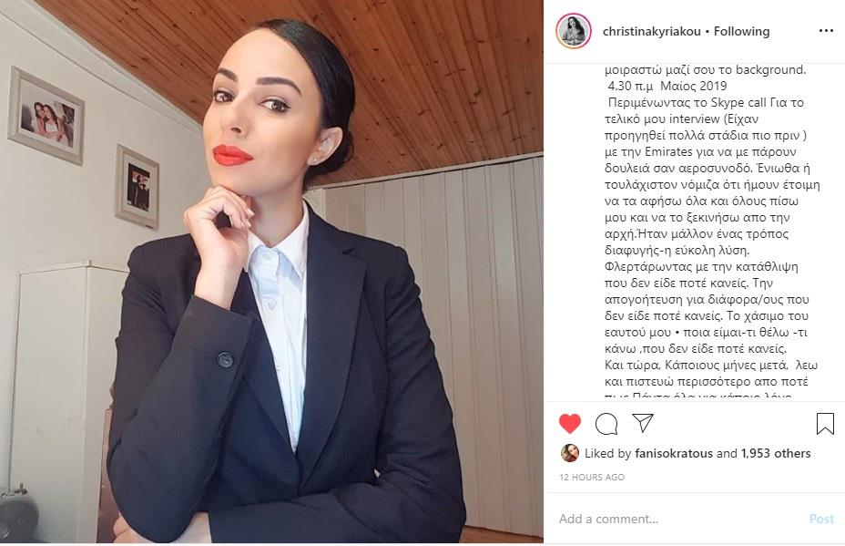 "Κάνοντας εκκαθάριση στο κινητό βρίσκω αυτή την φωτογραφία και ήθελα να μοιραστώ μαζί σου το background. 4.30 π.μ Μαίος 2019. Περιμένοντας το Skype call για το τελικό μου interview (Είχαν προηγηθεί πολλά στάδια πιο πριν) με την Emirates για να με πάρουν δουλειά σαν αεροσυνοδό. Ένιωθα ή τουλάχιστον νόμιζα ότι ήμουν έτοιμη να τα αφήσω όλα και όλους πίσω μου και να το ξεκινήσω από την αρχή. Ήταν μάλλον ένας τρόπος διαφυγής-η εύκολη λύση. Φλερτάροντας με την κατάθλιψη που δεν είδε ποτέ κανείς. Την απογοήτευση για διάφορα/ους που δεν είδε ποτέ κανείς. Το χάσιμο του εαυτού μου • ποια είμαι-τι θέλω -τι κάνω ,που δεν είδε ποτέ κανείς.