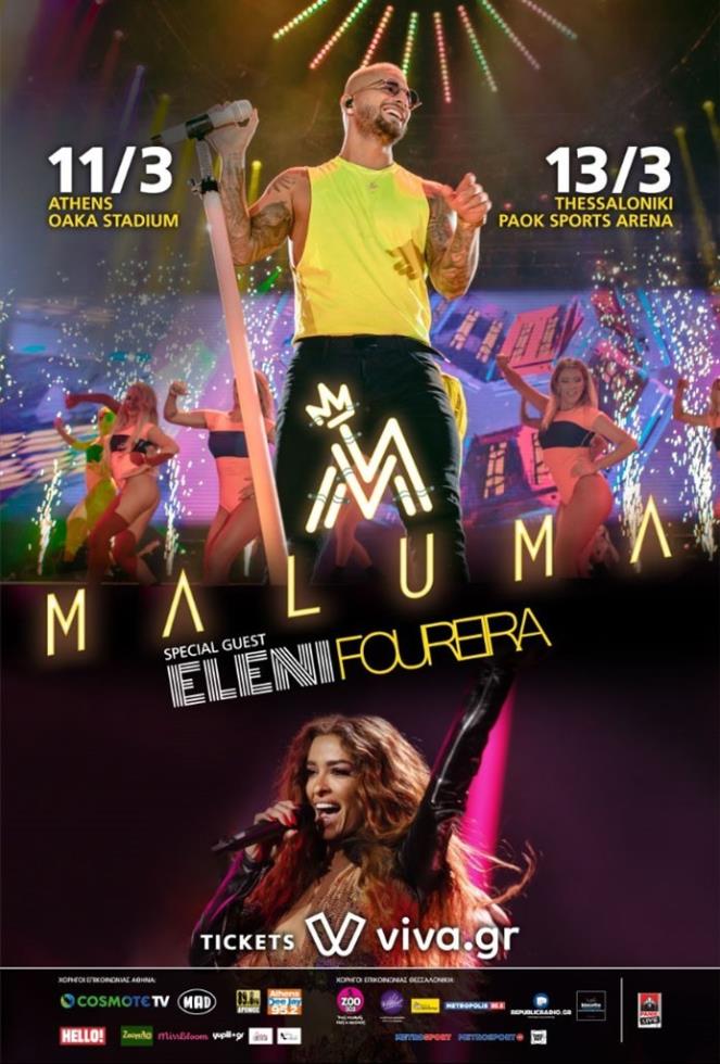 Τις συναυλίες θα ανοίξει η σαγηνευτική και απόλυτη pop star Ελένη Φουρέιρα. Η εκρηκτική performer θα είναι η special guest και στις δύο συναυλίες του Maluma στην Ελλάδα (Αθήνα, 11 Μαρτίου και Θεσσαλονίκη, 13 Μαρτίου).