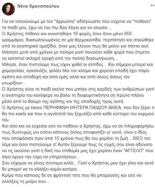 «Για να τελειώνουμε με τον «άρρωστο» αδιάγνωστο που εύχεται να «πεθάνει» το παιδί μου, έχω να του πω δύο λόγια για να ισιώσει… Ο Χρήστος πέθανε και αναστήθηκε 10 φορές όταν ήταν μόνο 850 γραμμάρια, διασωληνωμένος σε μία θερμοκοιτίδα, περπάτησε και σηκώθηκε από το αναπηρικό αμαξίδιο, όταν μας έλεγαν πως θα μείνει για πάντα εκεί. Μάσησε μετά από χρόνια με πείσμα γιατί πονούσε κάθε φορά που έπρεπε να καταπιεί σκληρή τροφή από την πολλή διασωλήνωση…
