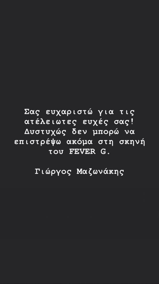 Συγκεκριμένα ο Γιώργος Μαζωνάκης έγραψε: «Σας ευχαριστώ για τις ατέλειωτες ευχές σας. Δυστυχώς δε μπορώ να επιστρέψω ακόμη στη σκηνή του Fever G».
